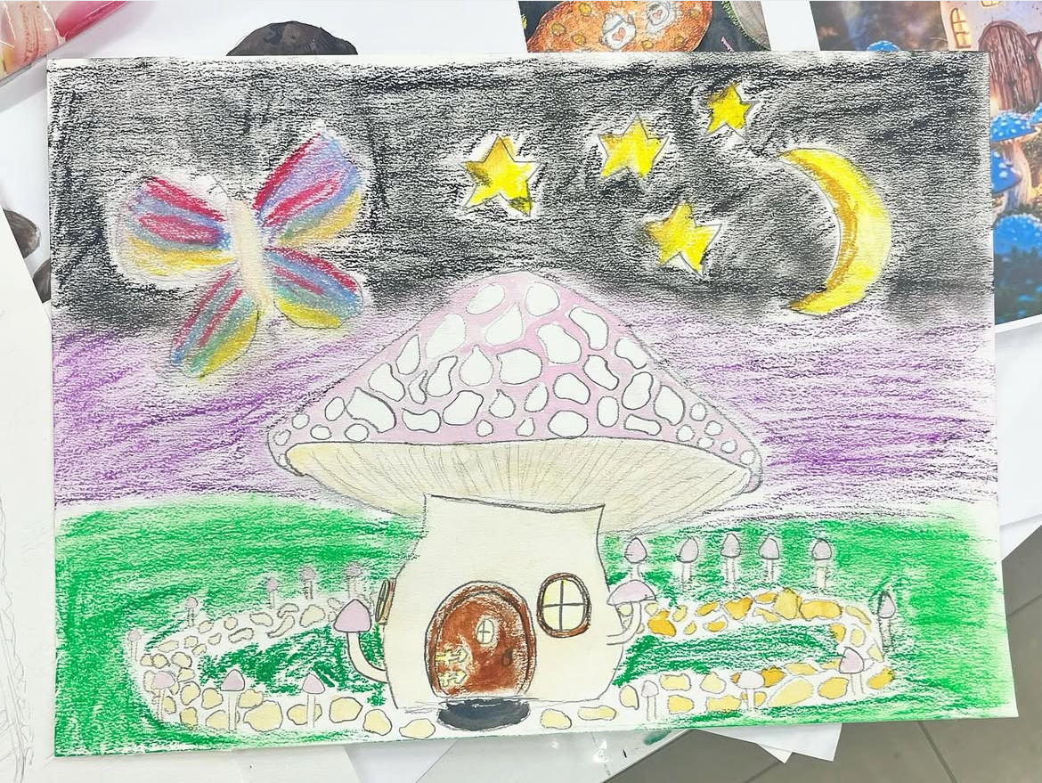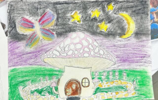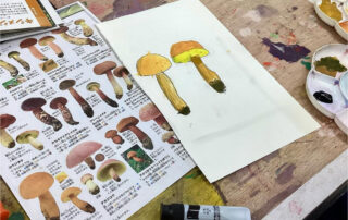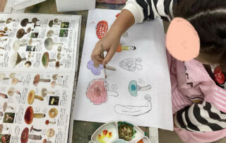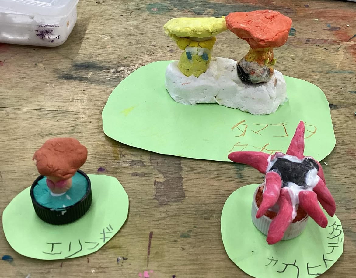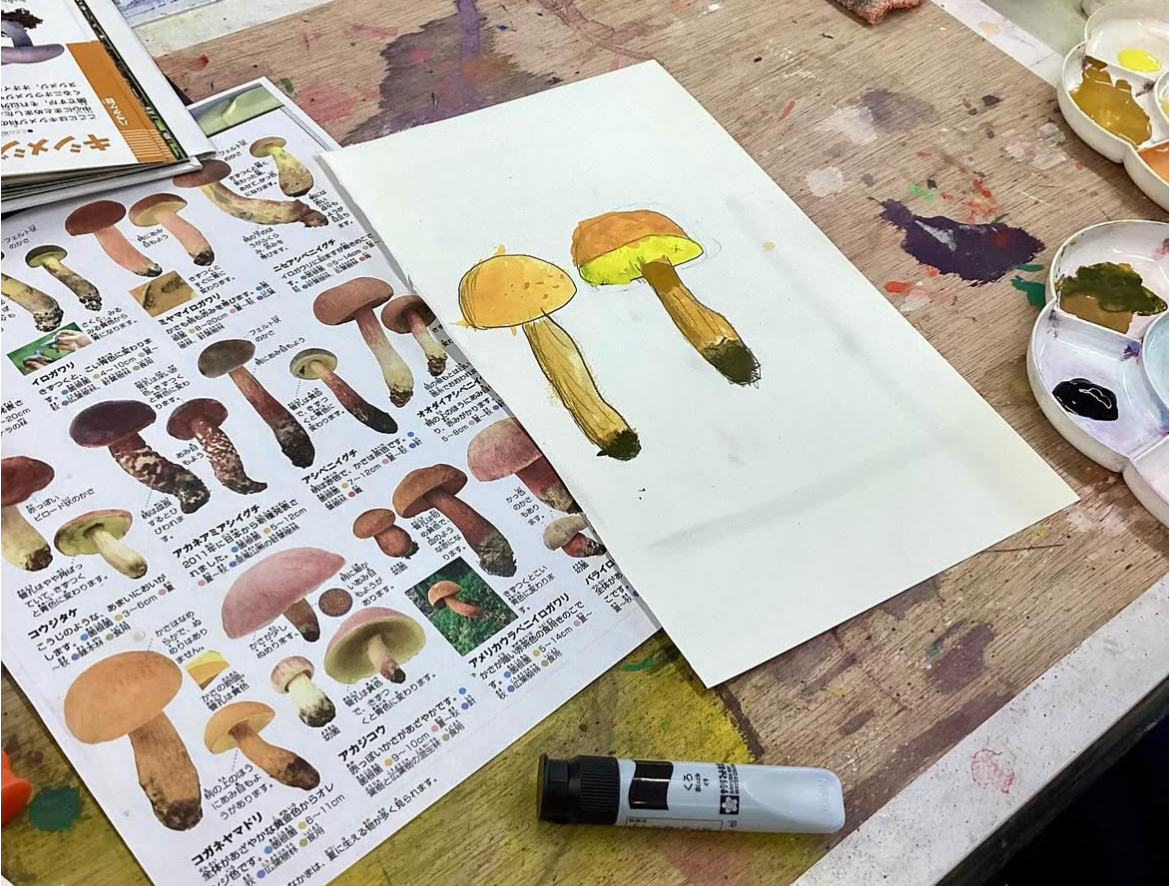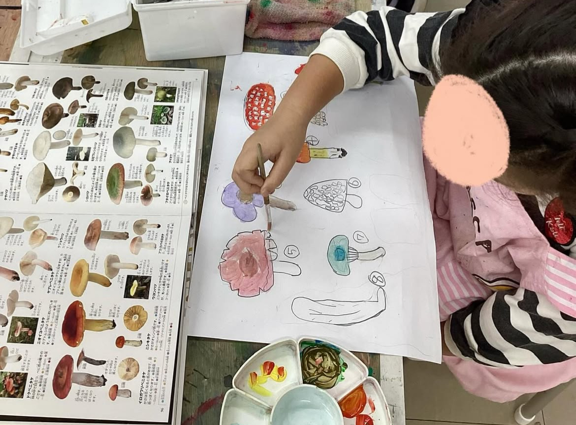 きのこを観察しよう。食べて美味しい食用きのこ、色がキレイな珍しいきのこ、触るのもダメな猛毒きのこまで、いろんなきのこを観察して絵を描きました。お店で見かけるお馴染みのきのこを目の前にして、匂いや触感を確かめたり。はじめは「きのこきらーい!」と言っていた生徒さんも、図鑑をみたり、どんなところに生えているのか想像したりと、どんどん想像が膨らみます。みんなの考えたこと観察したことが多彩な作品に仕上がりました〜!